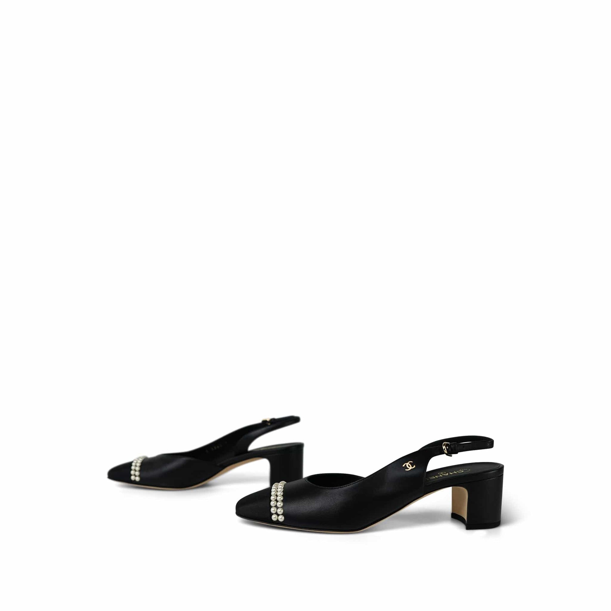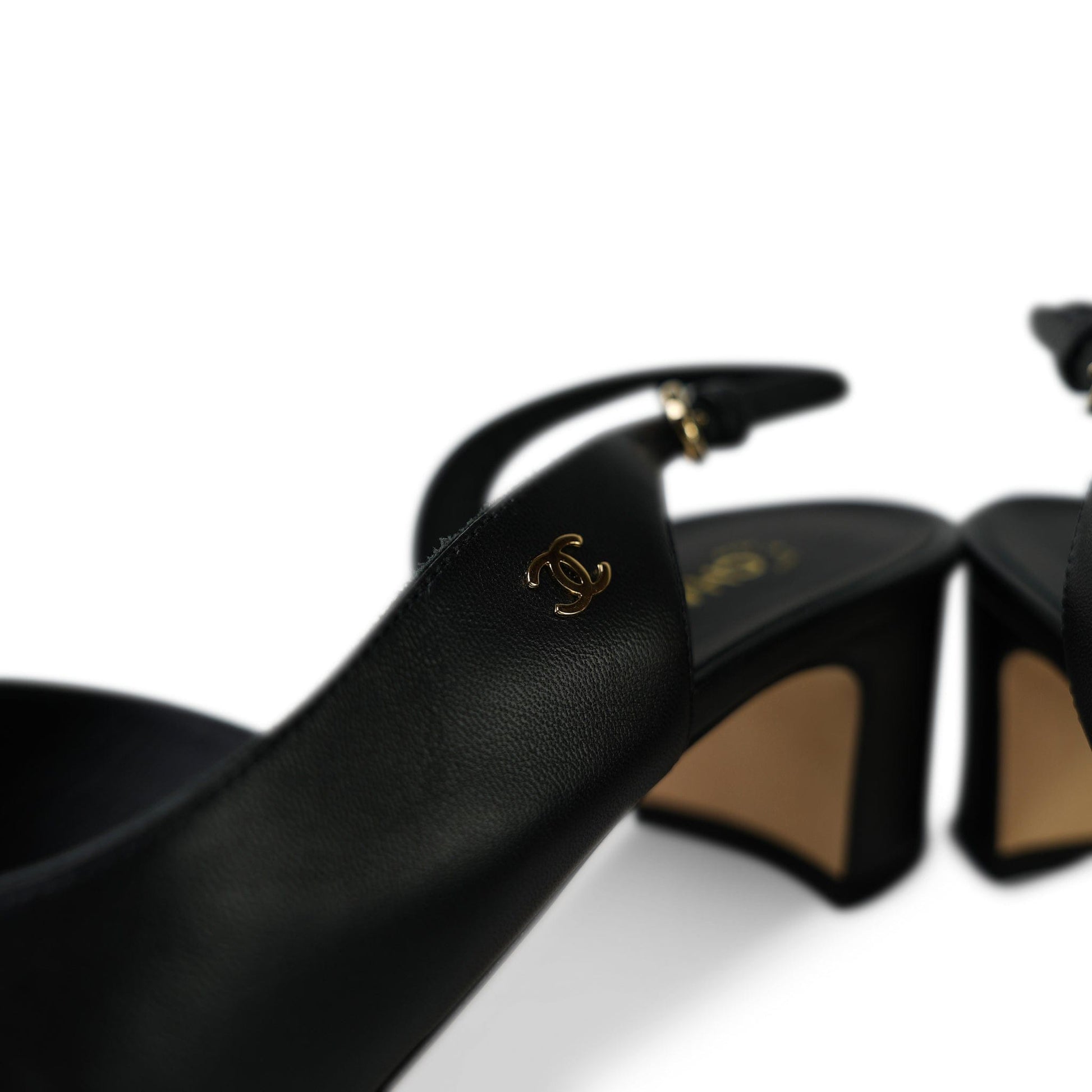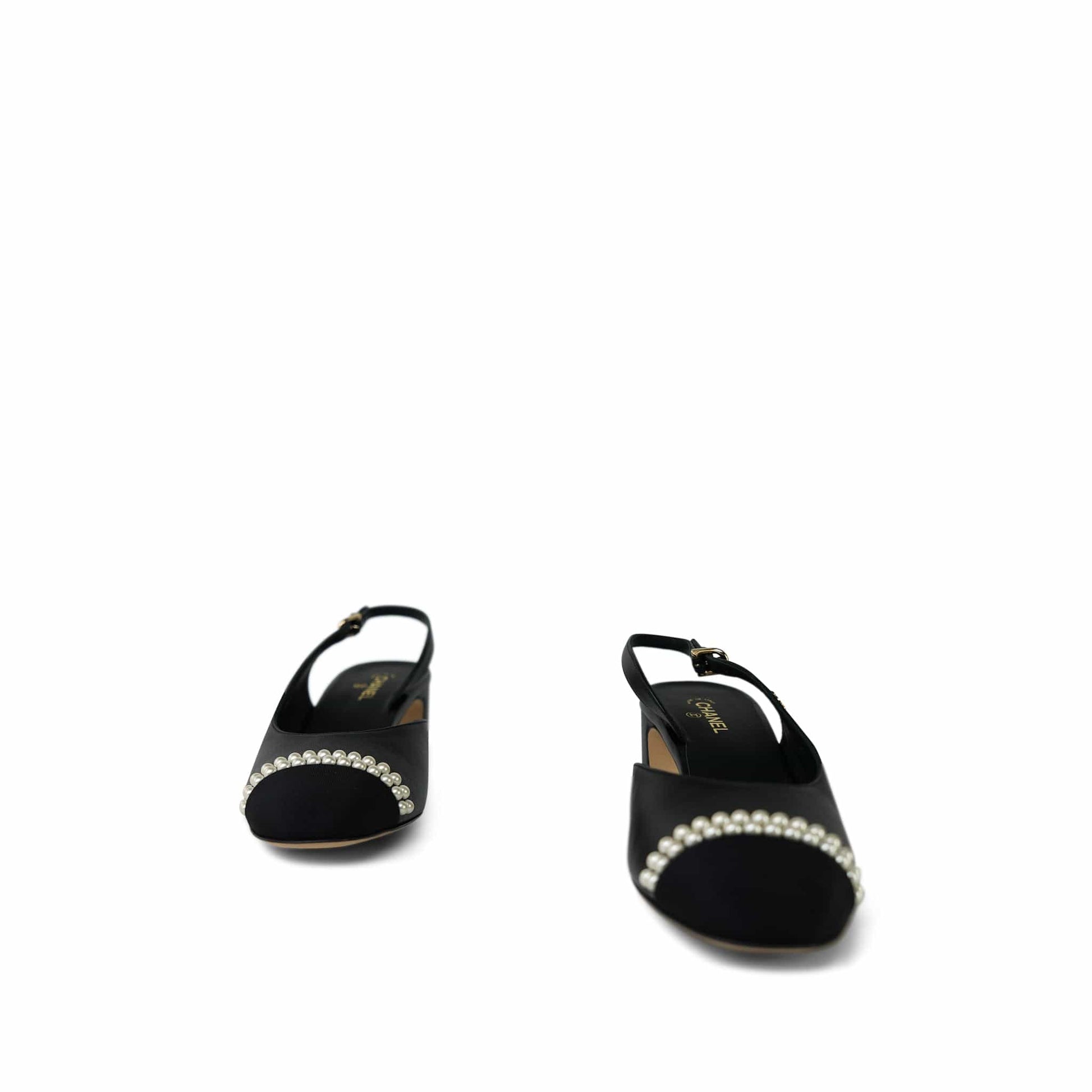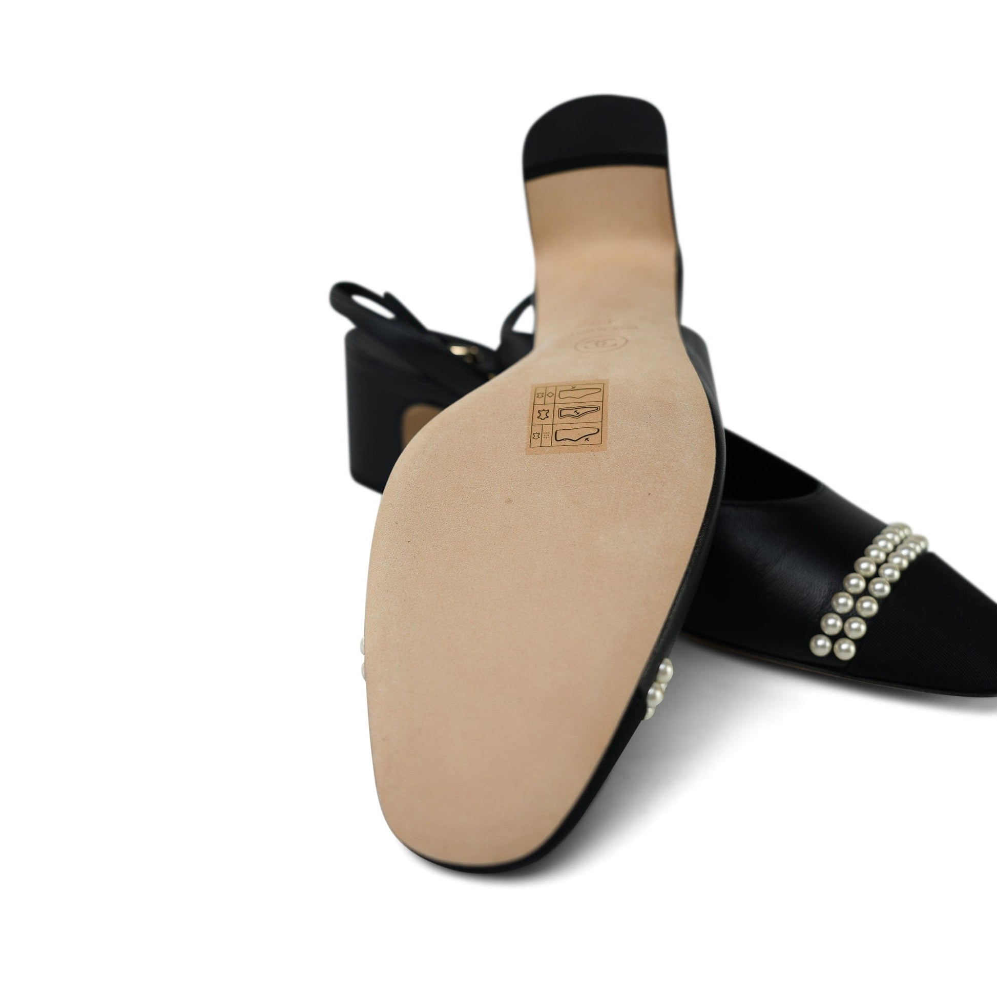 20P Black Lambskin Grosgrain Pearl Cap Toe CC Slingback Pumps Size 39.5