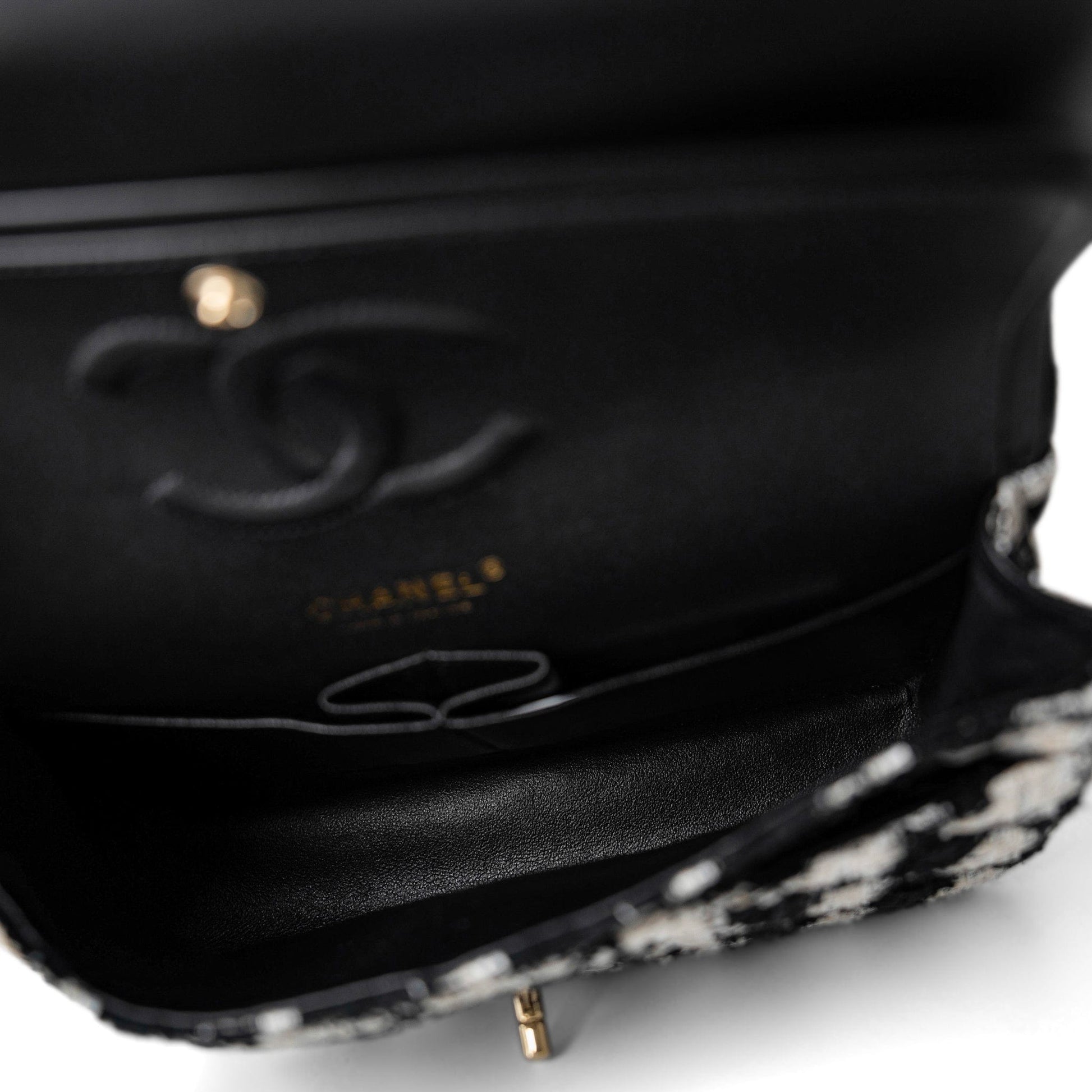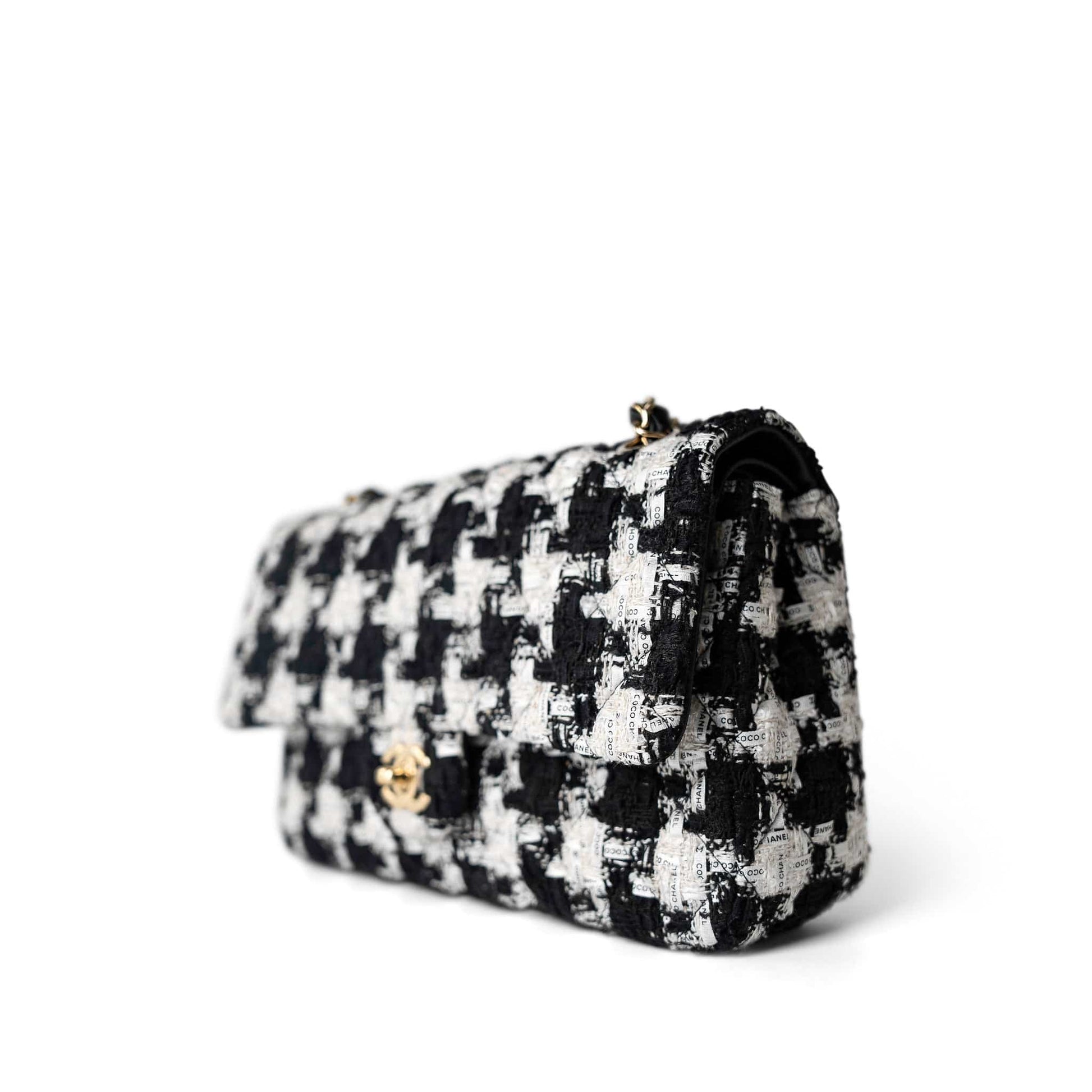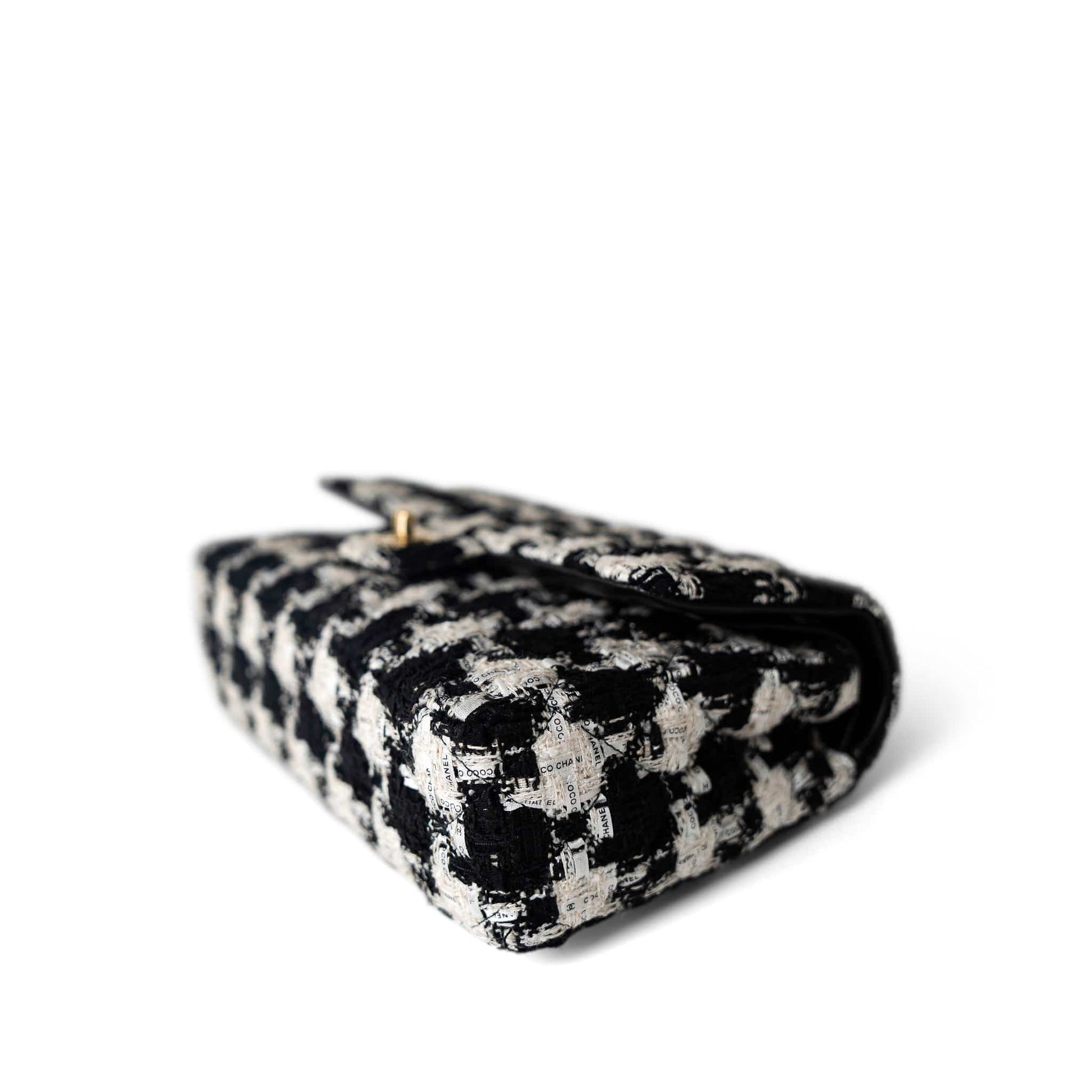 20s Black White Houndstooth Tweed Quilted Classic Flap Medium Light Gold Hardware
