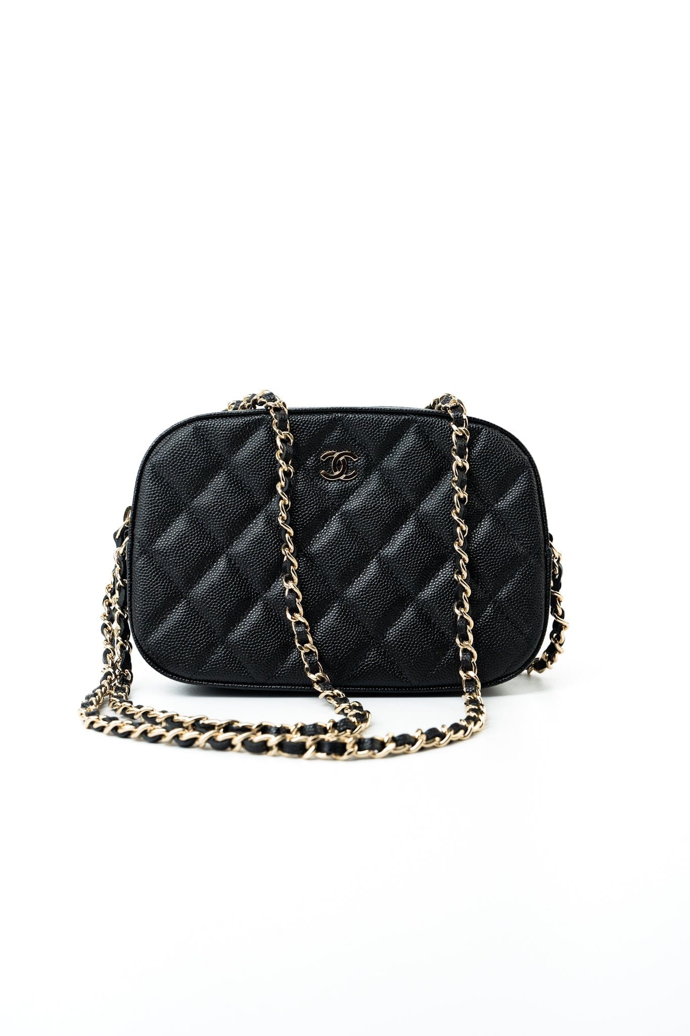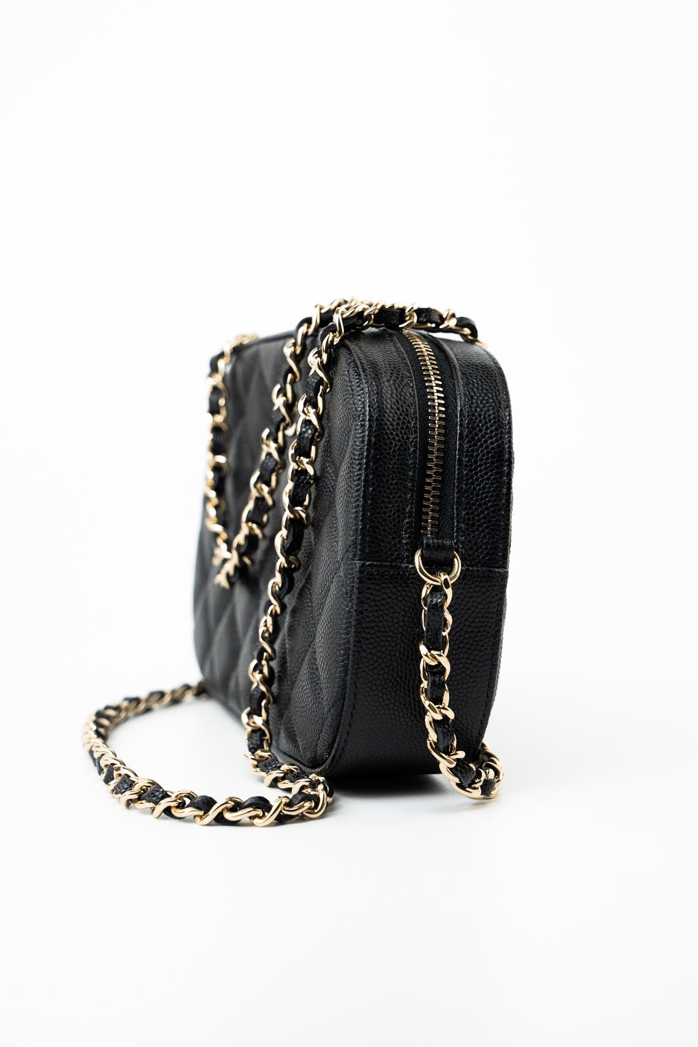 21A Black Caviar Quilted Camera Case Gold Hardware