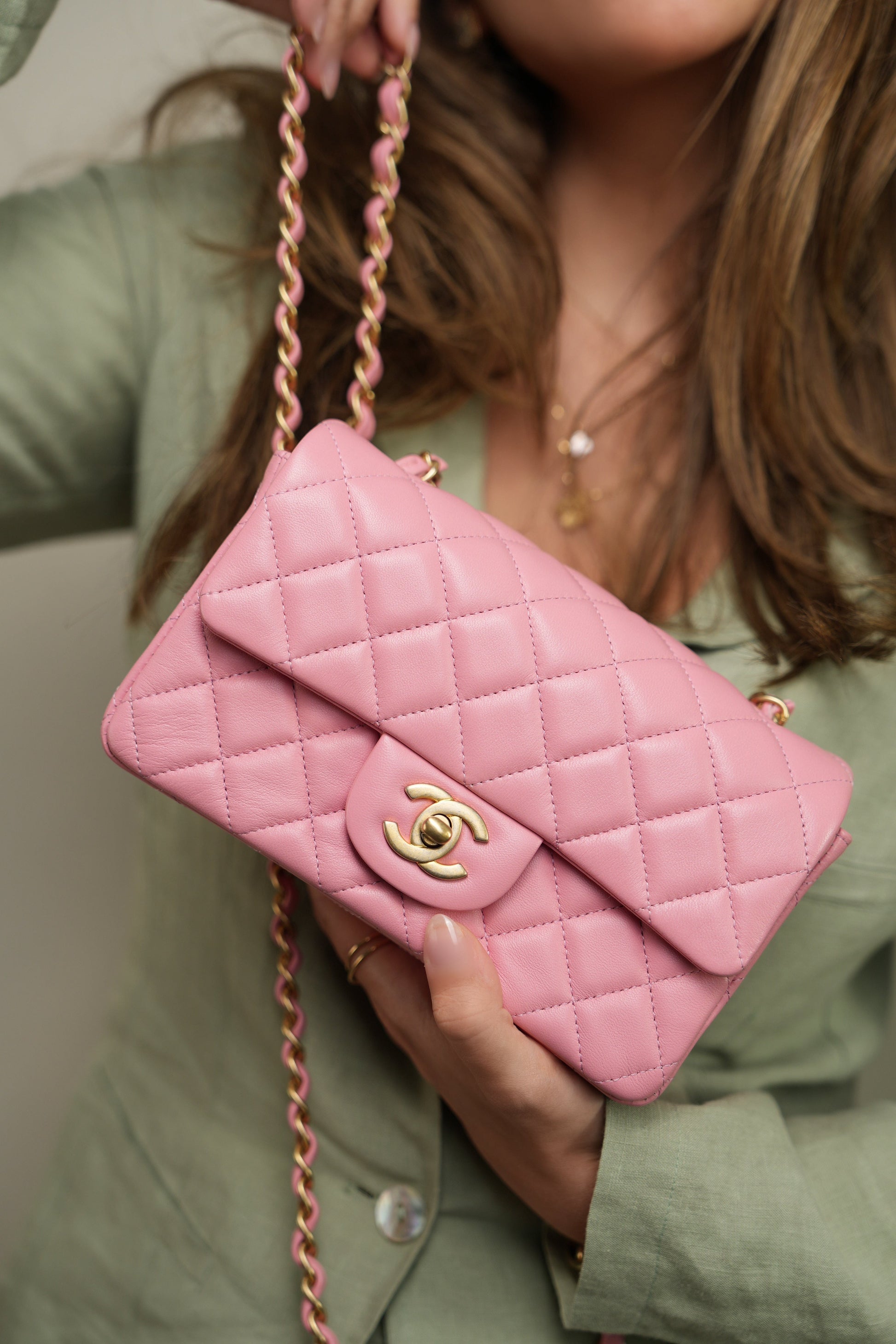 19s Pink Lambskin Quilted Mini Rectangular Flap Aged Gold Hardware