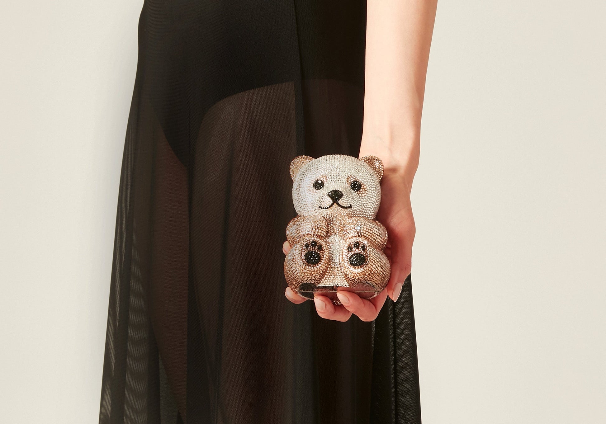 Introducing our Teddy Bear Mark Handbag, a perfect blend of charm and elegance. Designed in the shape of a bear, this unique handbag is adorned with soft beige, golden, and mocha crystals, creating a subtle, neutral color palette reminiscent of a panda. With its adorable silhouette and exquisite crystal detailing creates the perfect companion for all animal lovers.