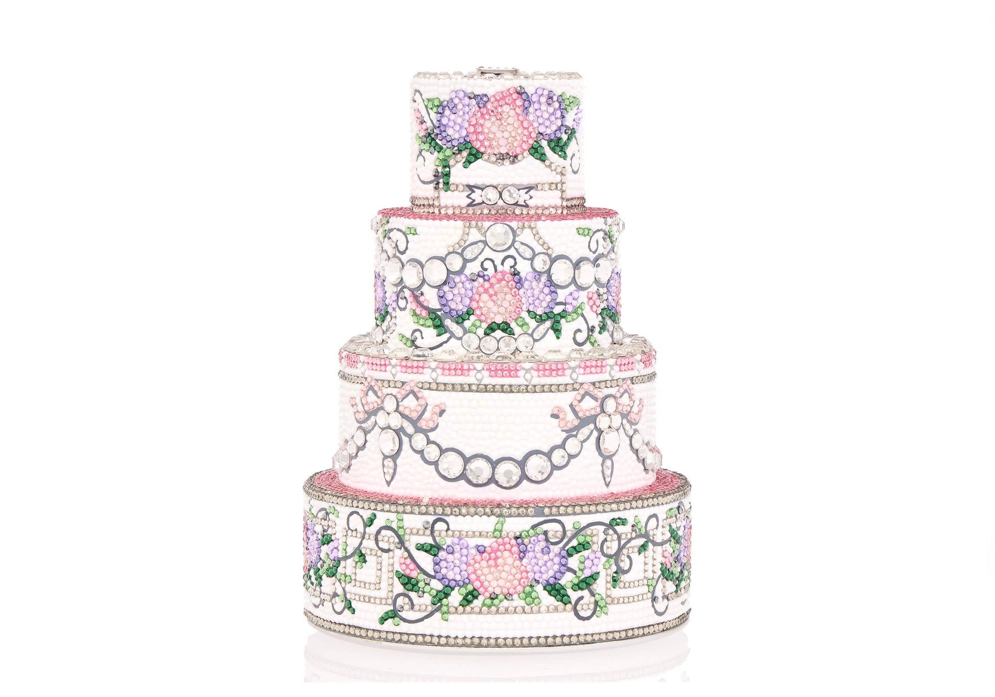 This crystal clutch was inspired by an extravagant wedding cake in white and pastel colors. Decorated with silver bow, pastel garlands and details that evoke the romance of an unforgettable day.