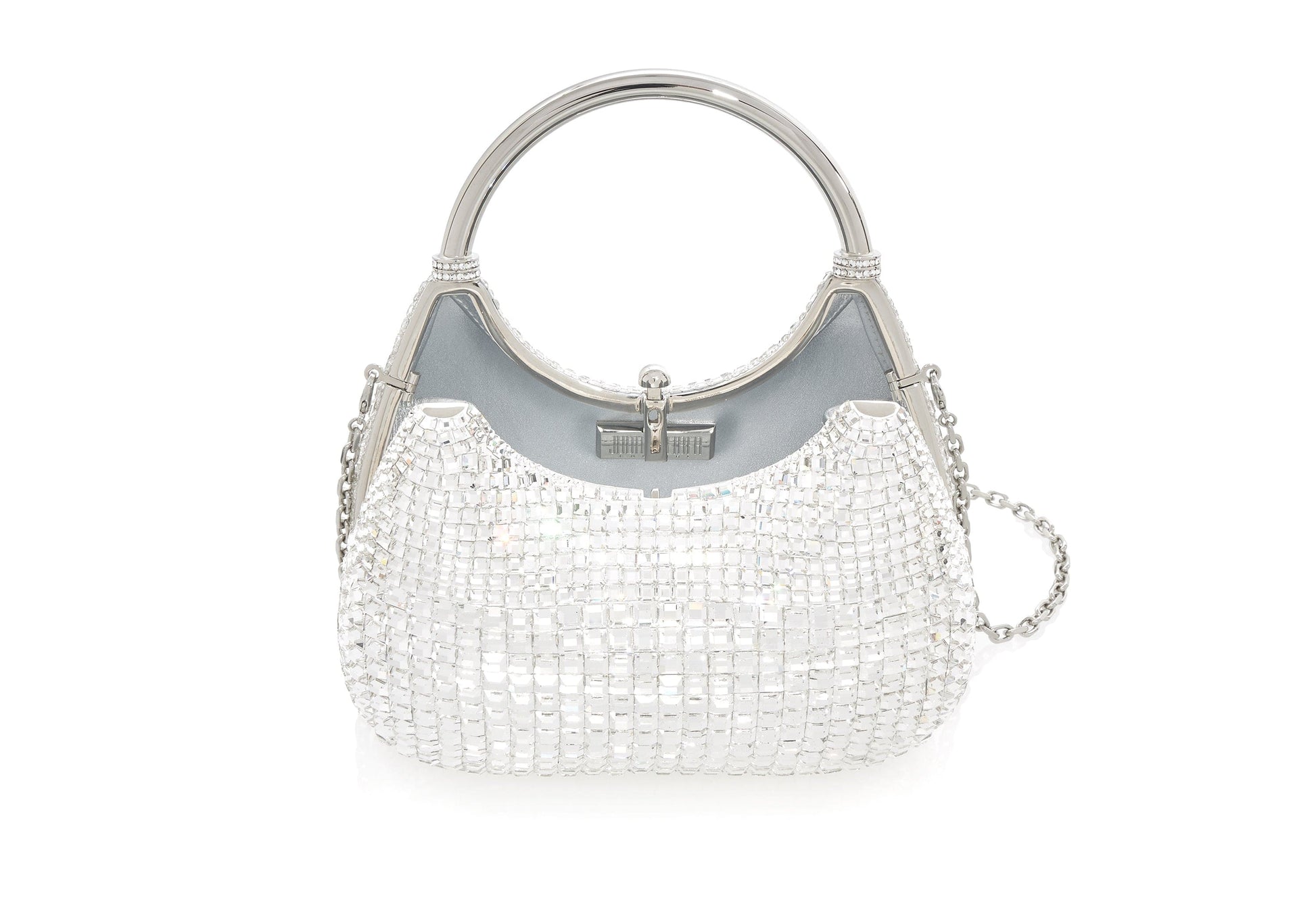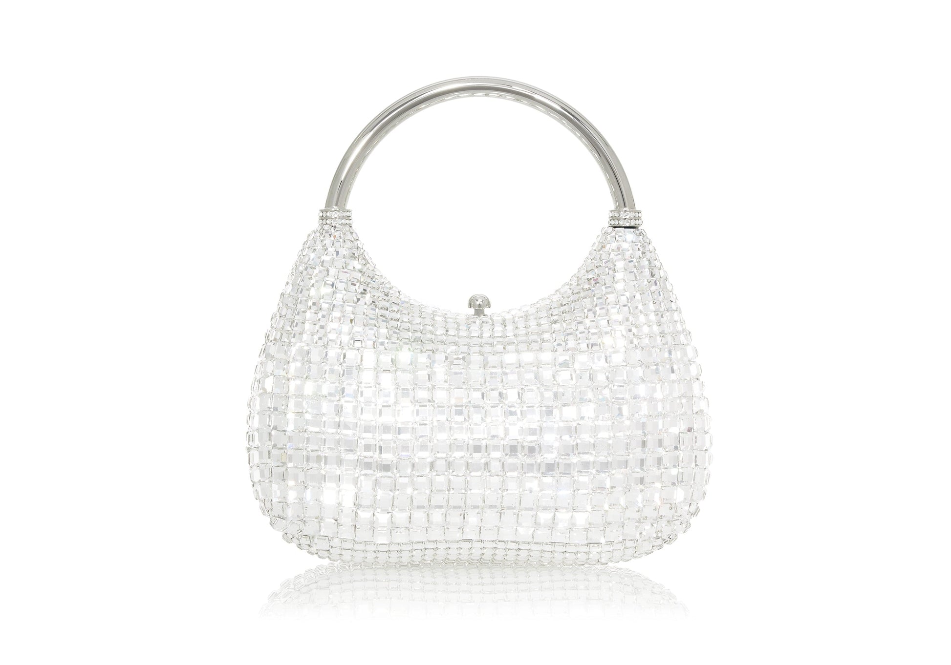 Sparkling silver disco square crystals shimmer and shine in captivating harmony with classic smooth crystals, merging into a graceful gradient adorning our sleek silver-handled hobo-shaped clutch. An alluring blend of bright sparkle and soft textures, this eye-catching clutch will be sure to make a statement at your next evening out.
