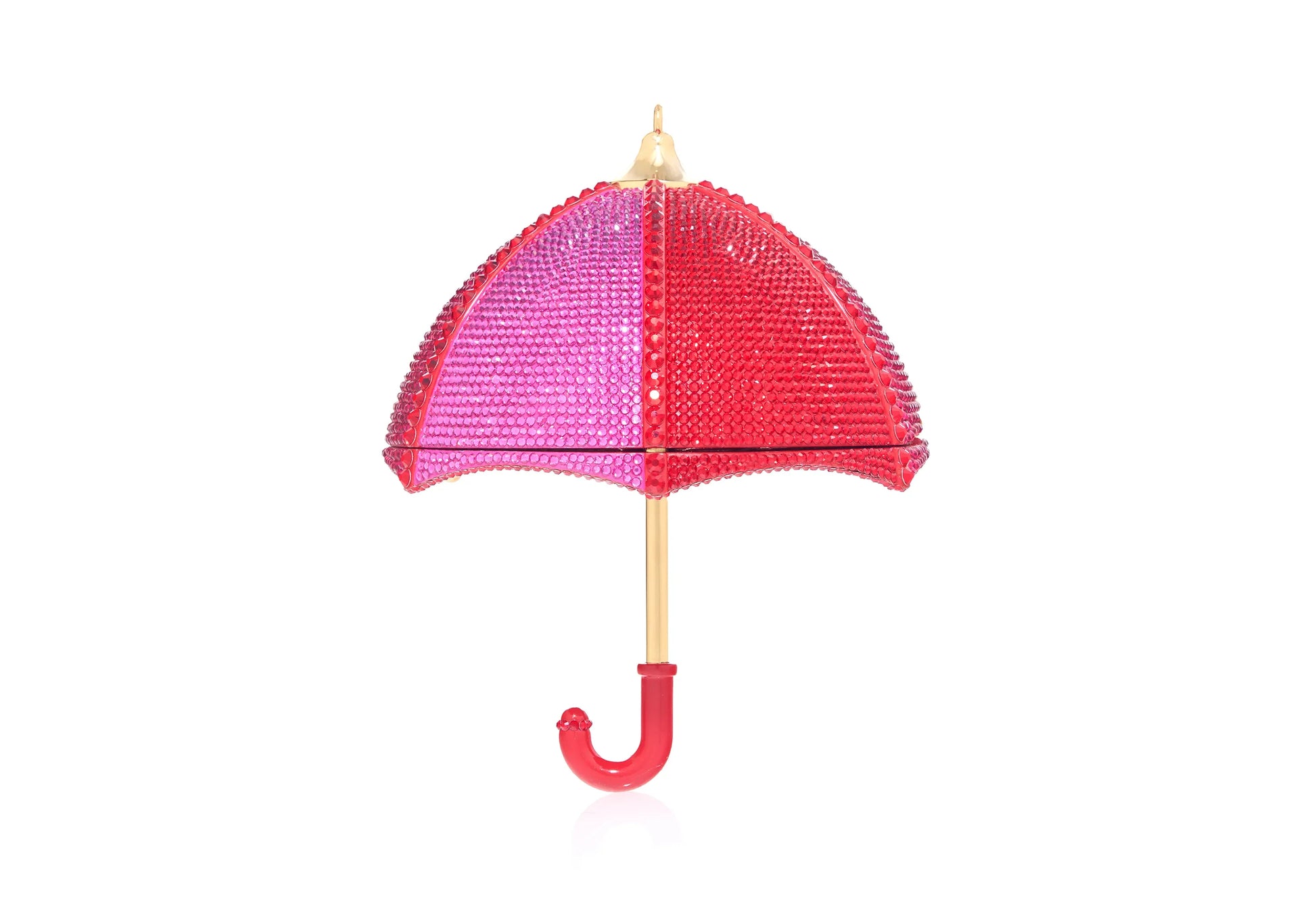 Add a vibrant pop of color to your collection with our Beatrice Umbrella clutch. Crafted with dazzling ruby, red, and fuchsia crystals, this eye-catching design captures the playful shape of an umbrella. The crystal adorned rim and handle add a touch of charm, while its bold hues make it the perfect statement piece for evening events or elevating your everyday style. Wear it with your favorite party dress for a fun and flirty look.