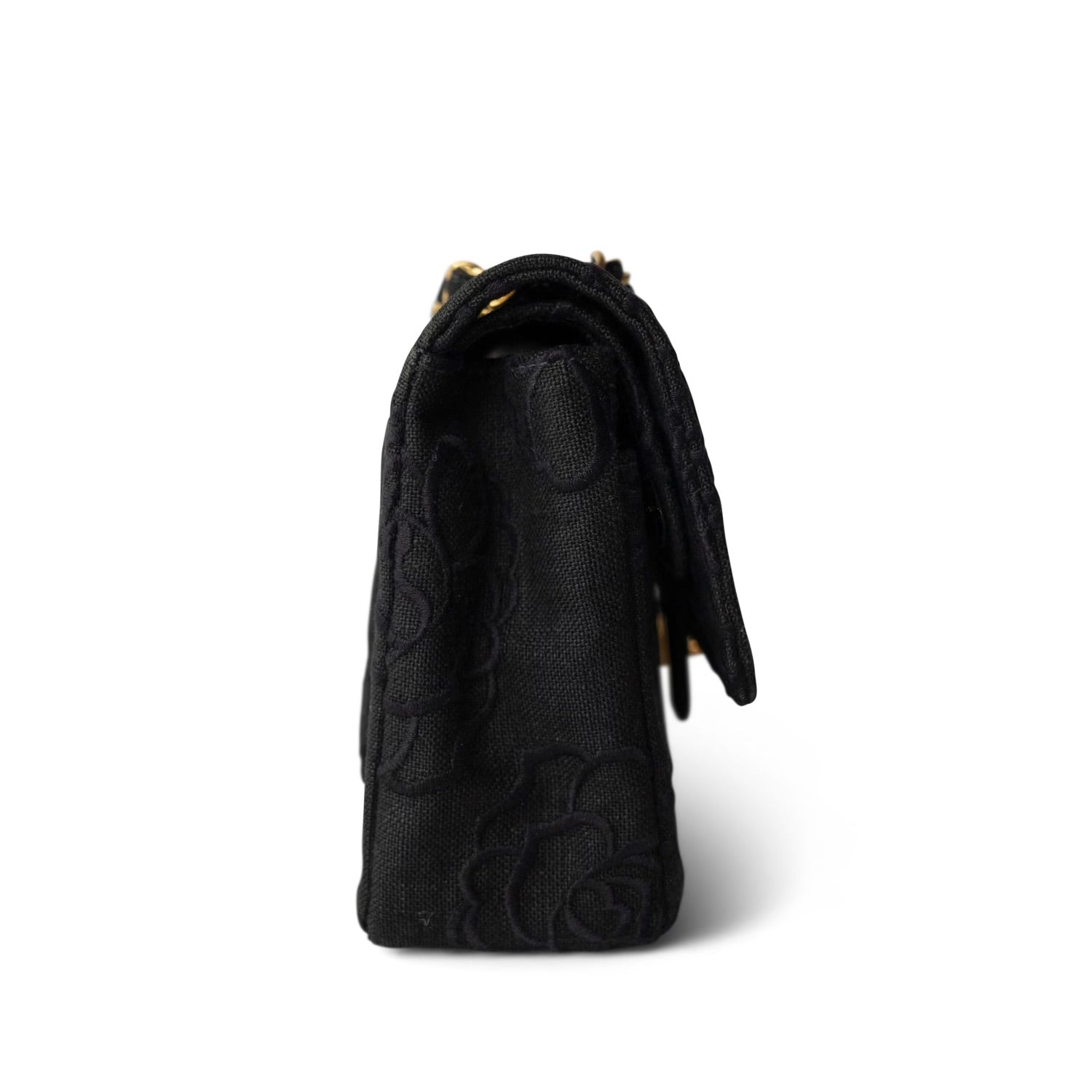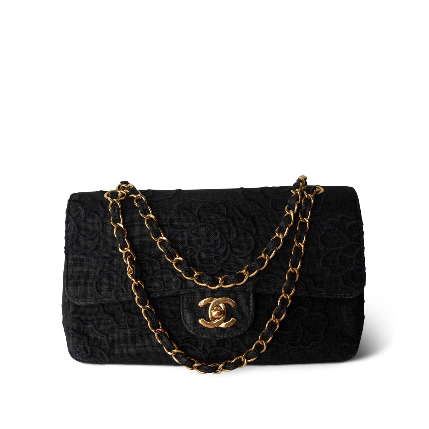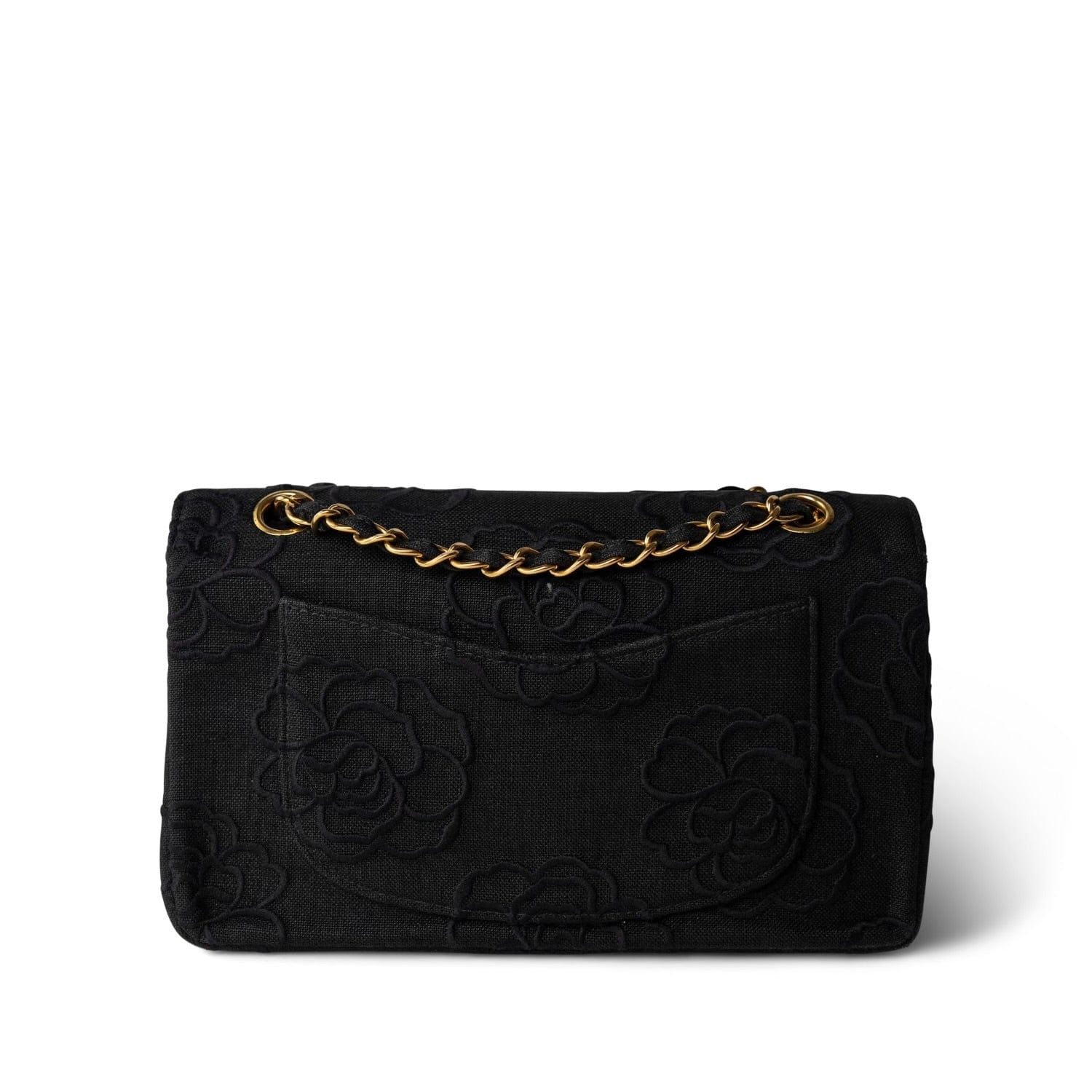 Vintage Black Canvas Camellia Classic Small Double Flap Gold Hardware