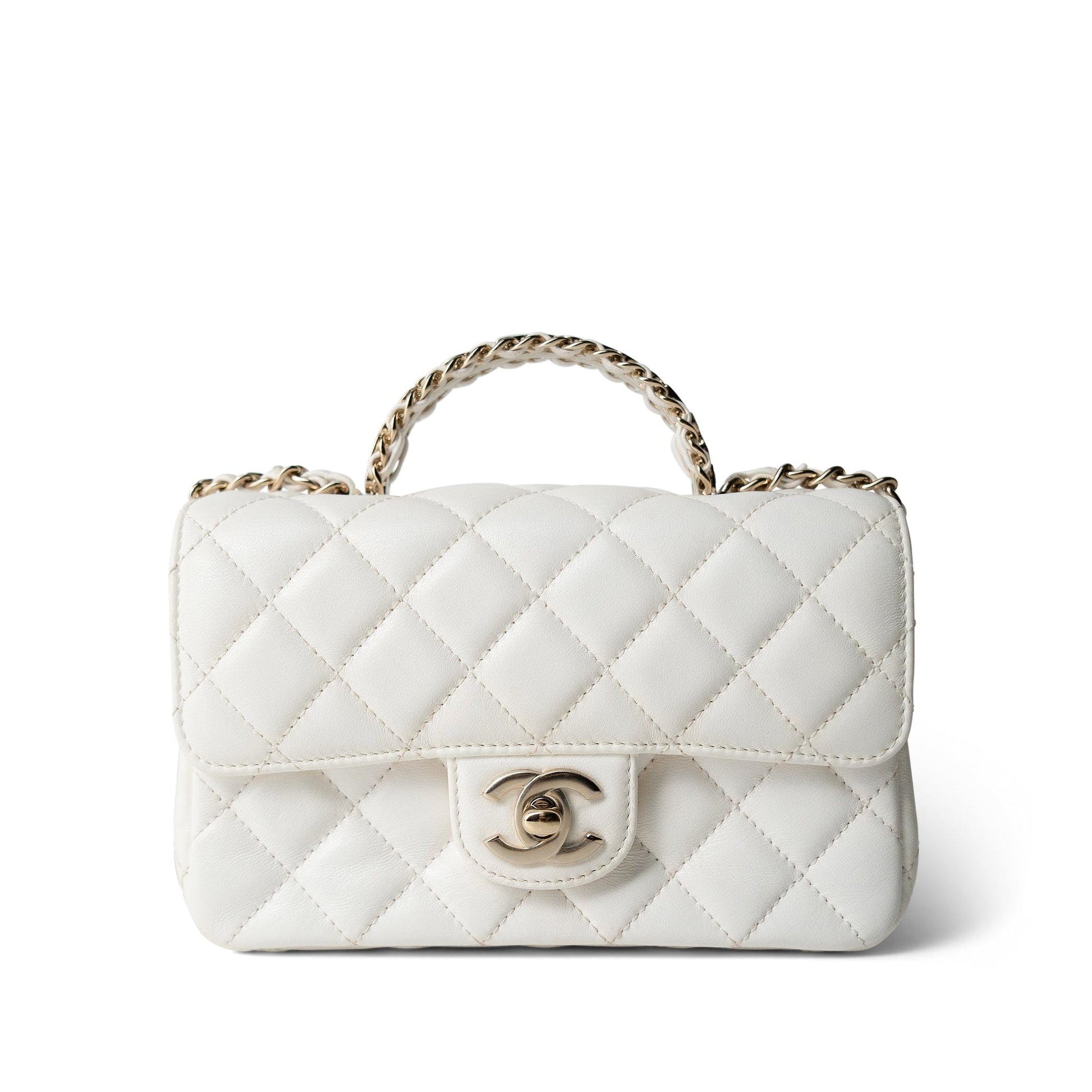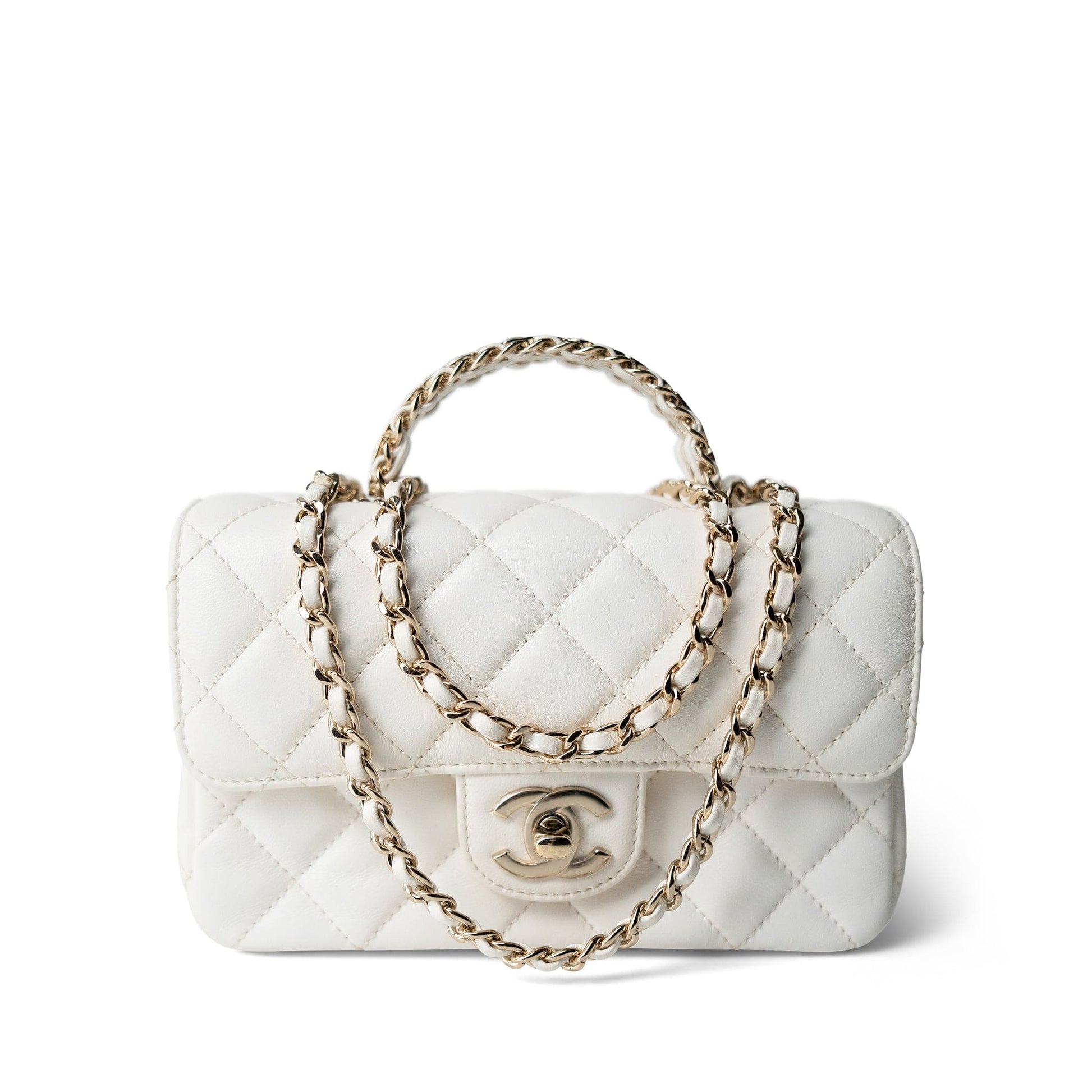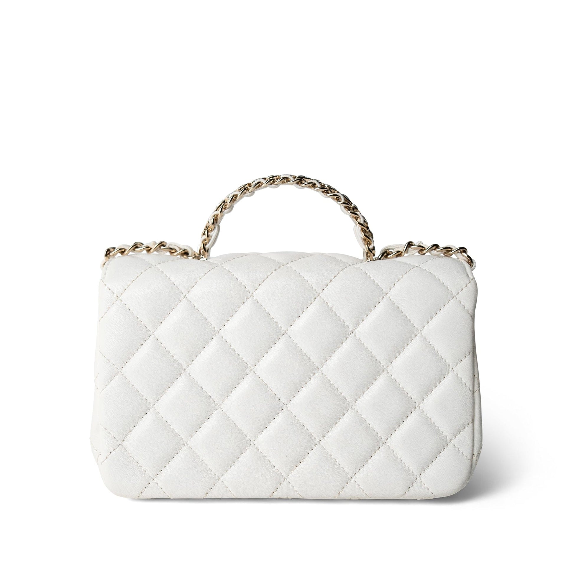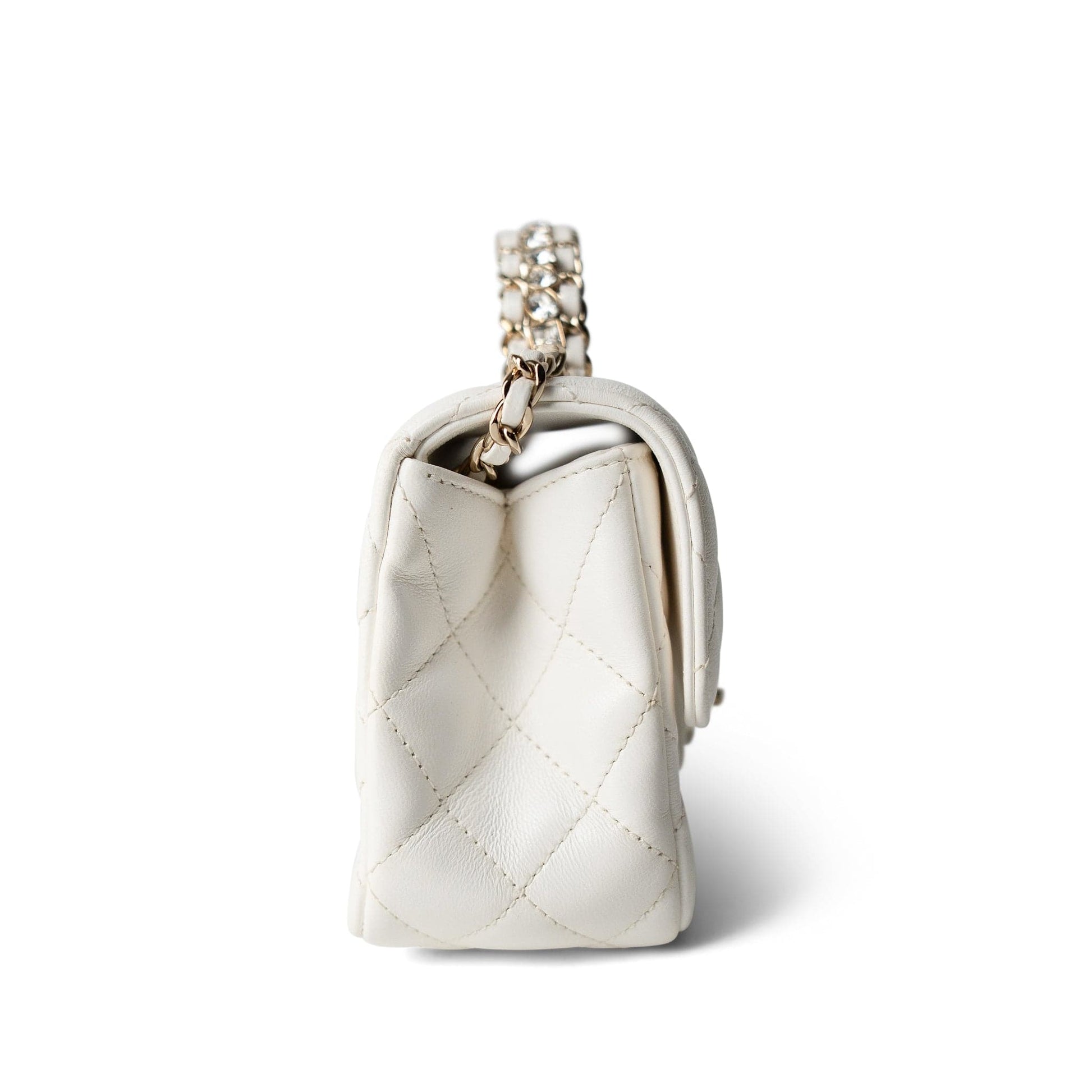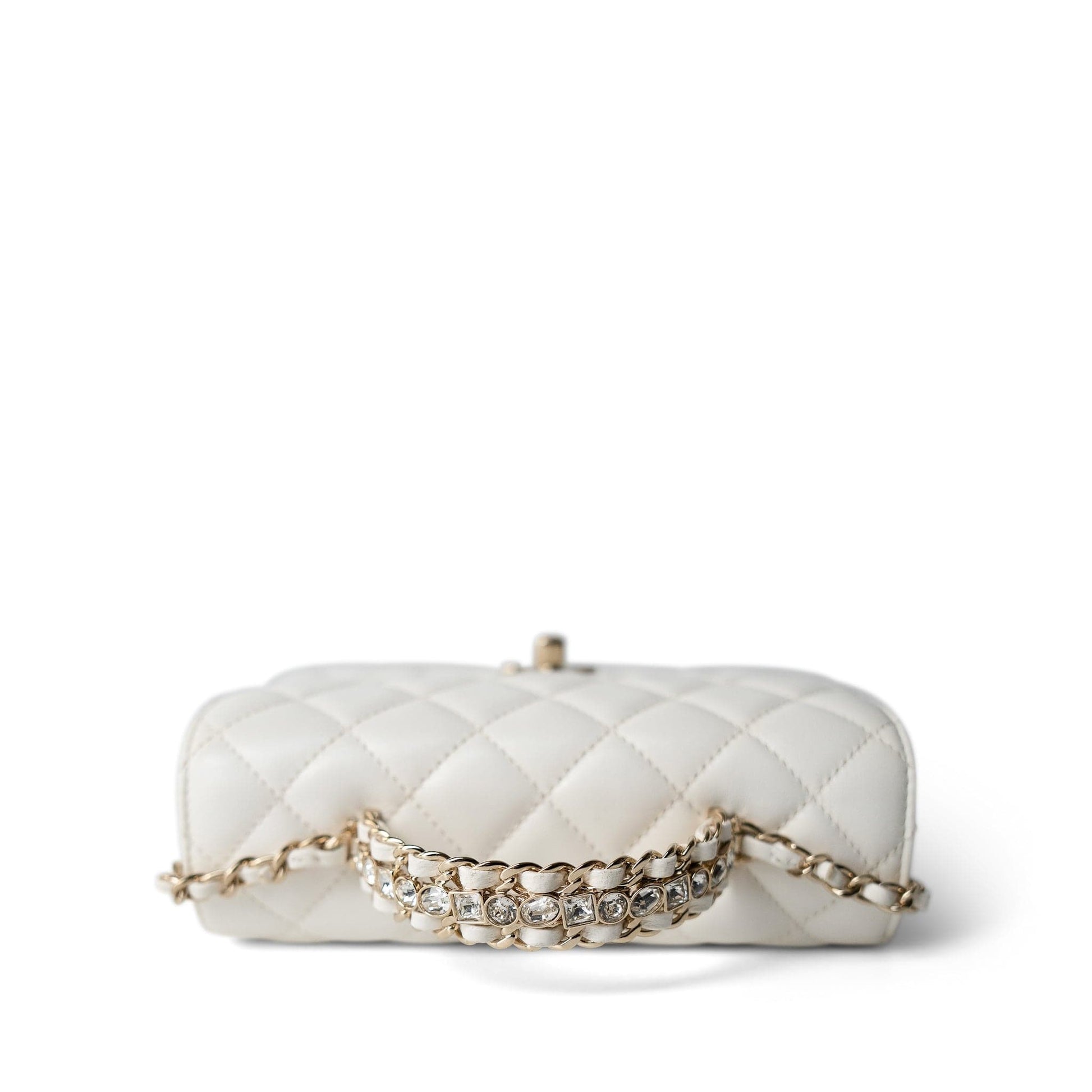 White Lambskin Quilted Crystal Top Handle Flap Light Gold Hardware