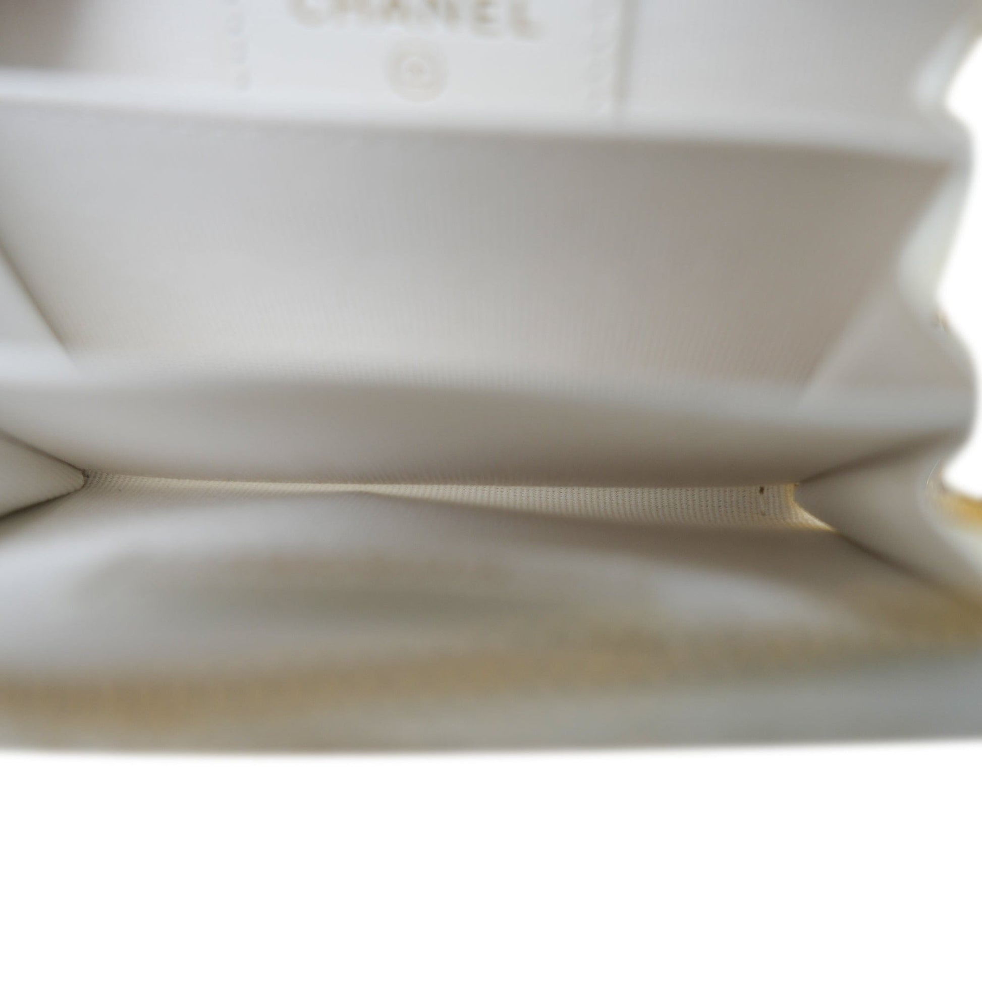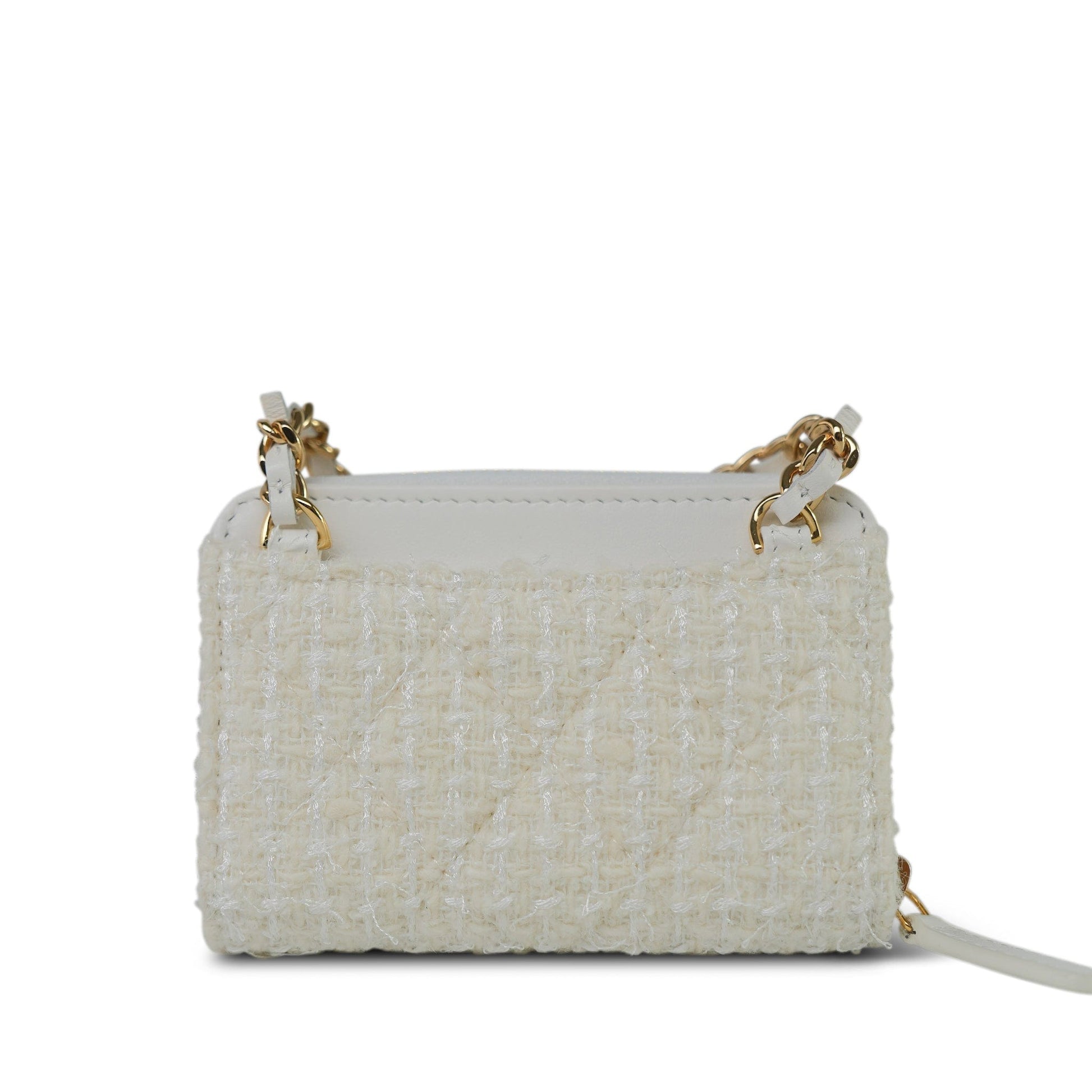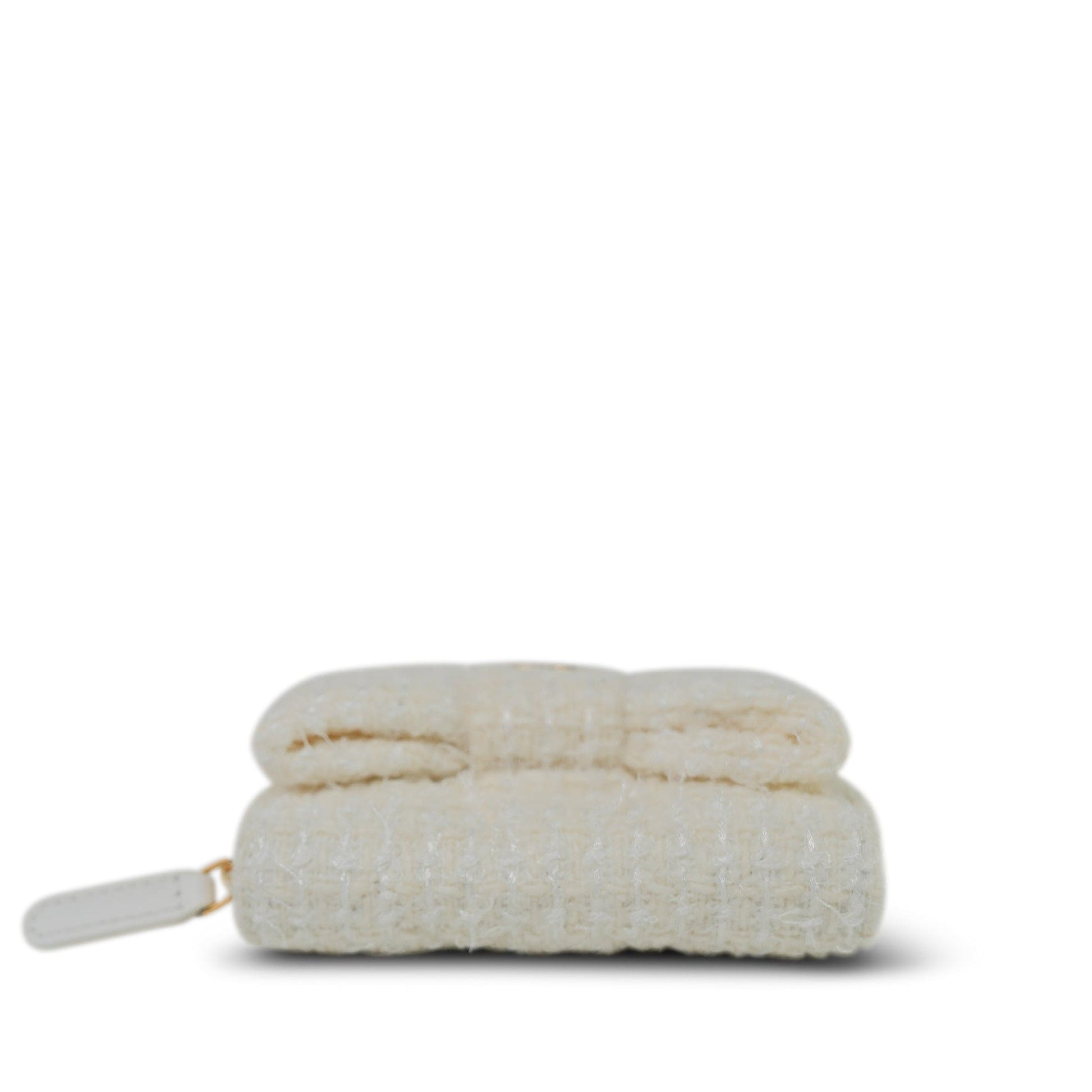 White Tweed Quilted Bow Card Holder On Chain Light Gold Hardware