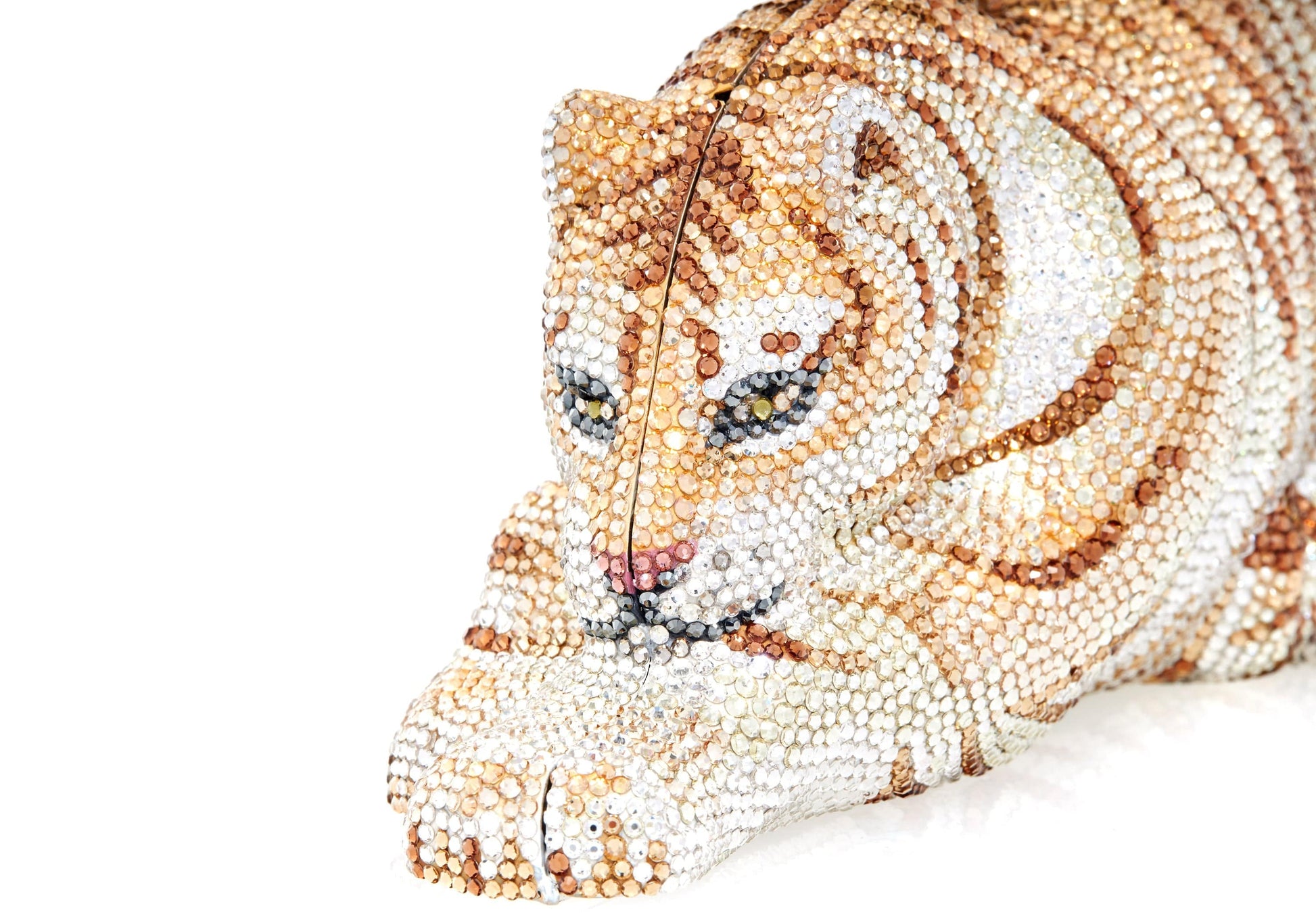 A captivating tribute to the majestic big cat family, our Wildcat Golden Cub crystal clutch crafted with intricate detail, showcases shades of light blonde and clear crystals transitioning into touches of topaz bronze and amber, creating an exotic allure that's truly unparalleled. Embodying the essence of solitary beauty, this handbag stands alone as an exquisite expression of untamed elegance, making a daring statement that captures the essence of the wild.