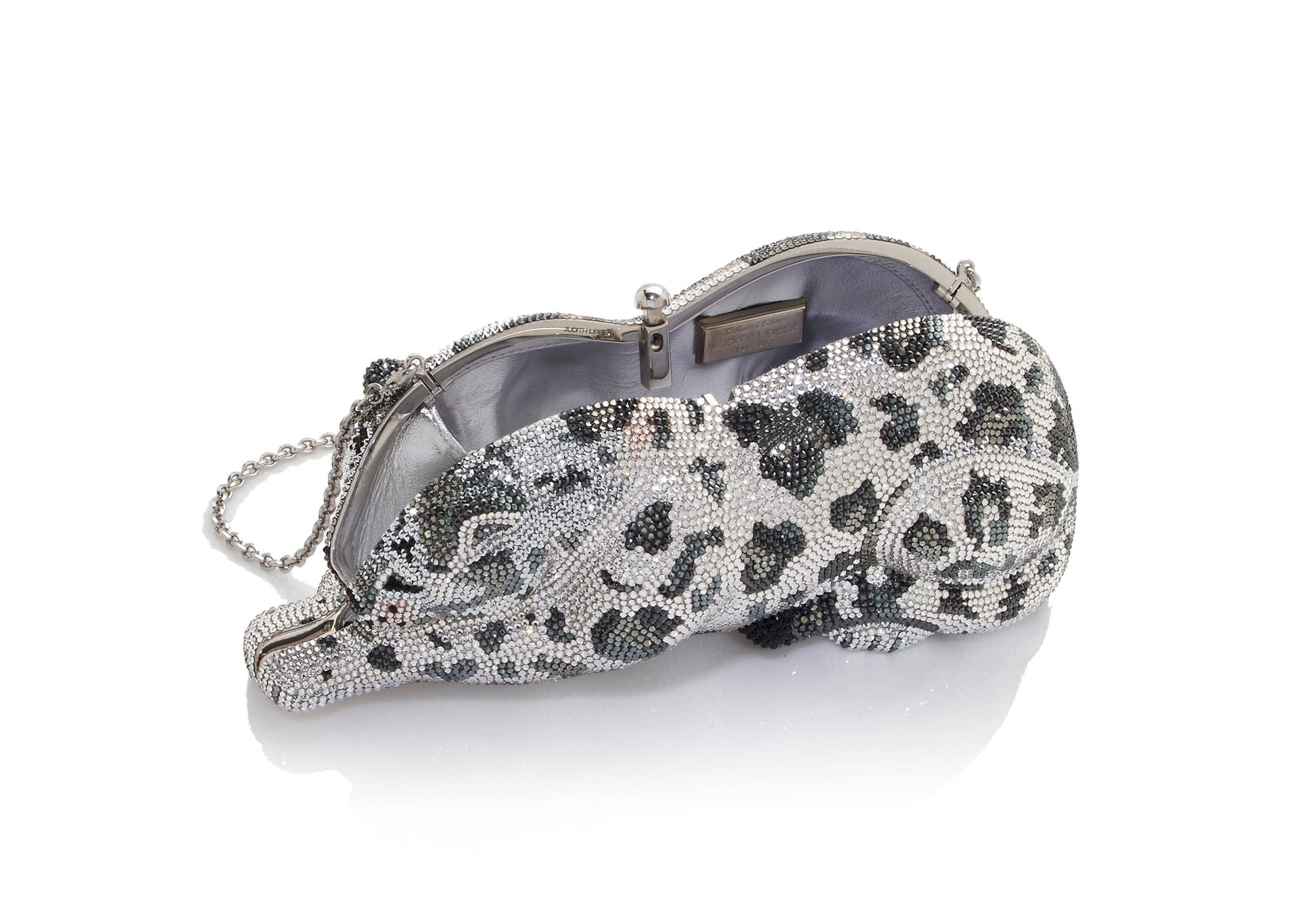 Experience the elegance of majestic felines with our Wildcat Snow Leopard crystal clutch. Adorned with intricate leopard print and shimmering crystal accents, this handbag captures the elusive beauty of these regal creatures. A true statement piece that will elevate any outfit.