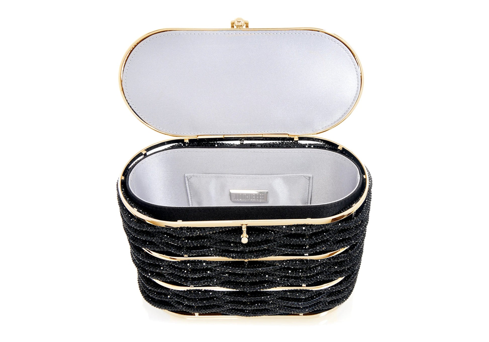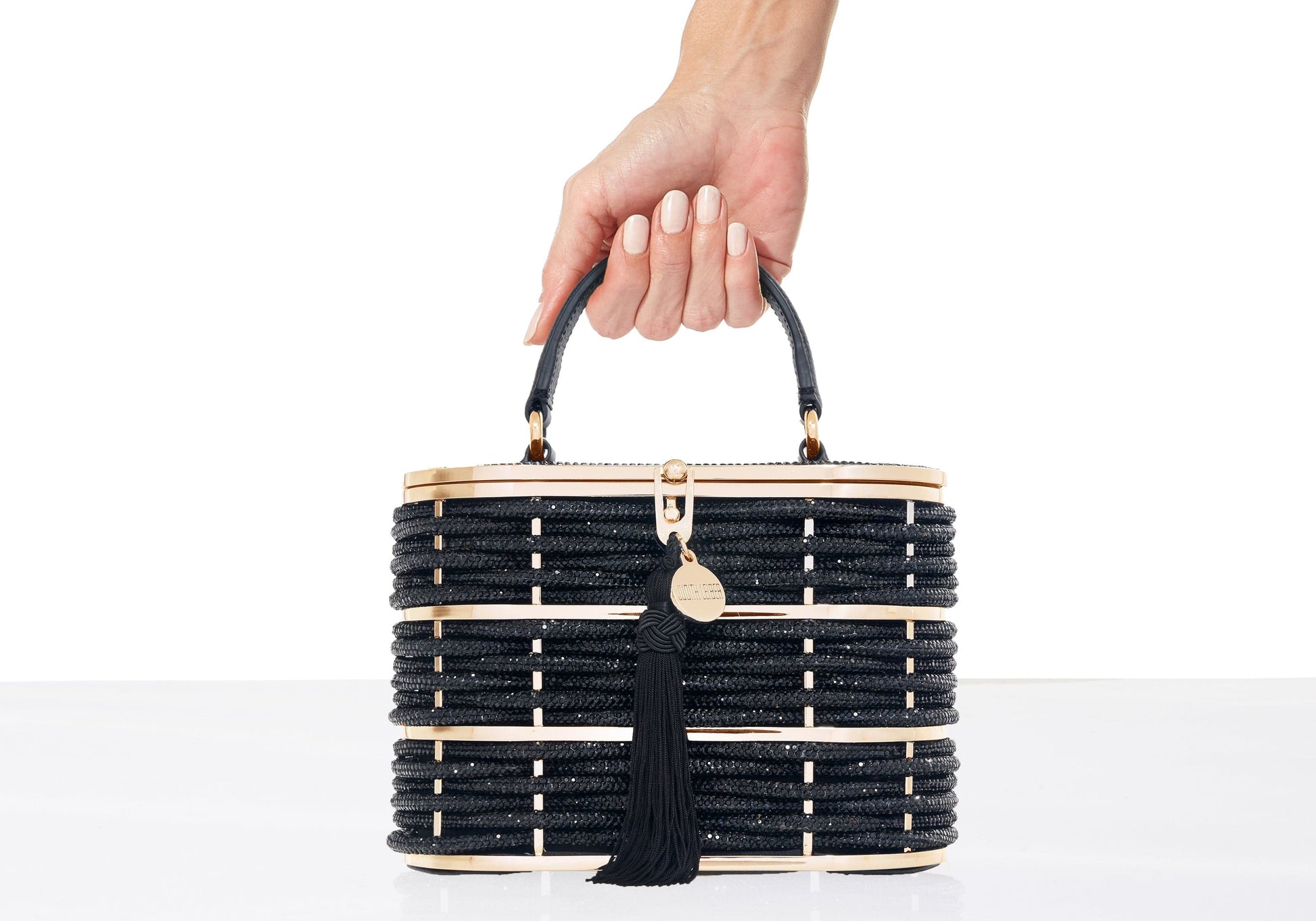 This Willow Basket handbag in black crystal has an oval shape and intricate black woven crystal laced through gold hardware for a sophisticated look. The crystal-adorned top features a latch closure and features a silk tassel and JL medallion, adding luxurious flair. Complete with a leather top handle, this bag offers both style and comfort for a chic and refined look.